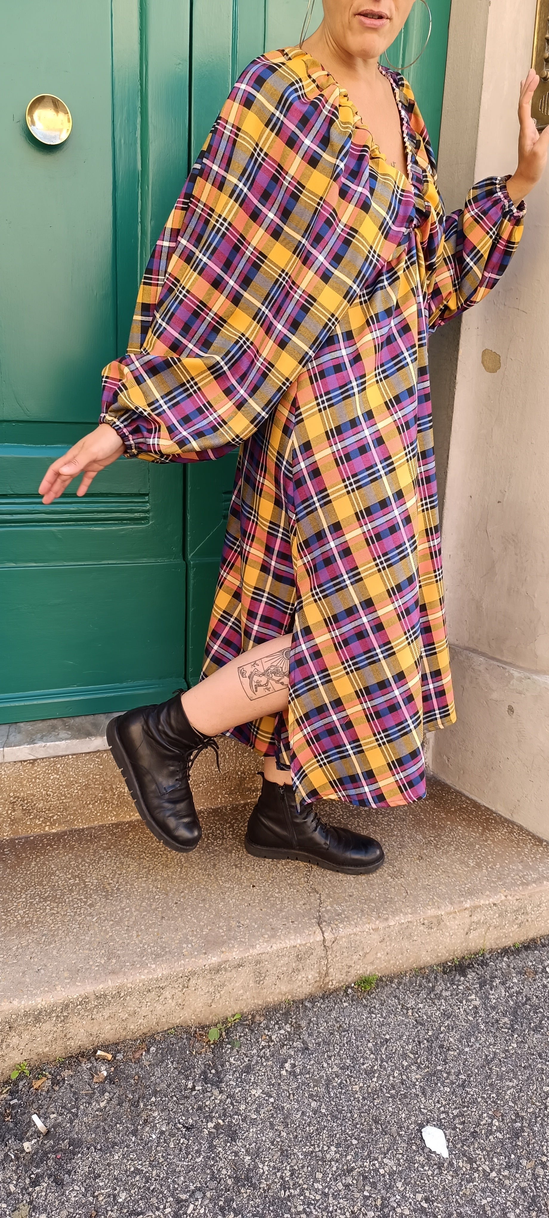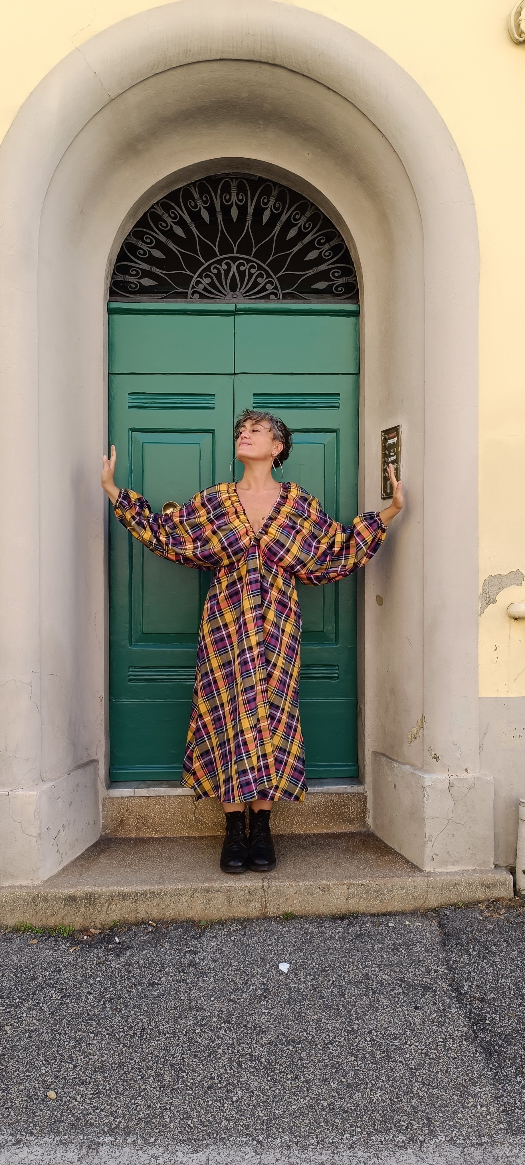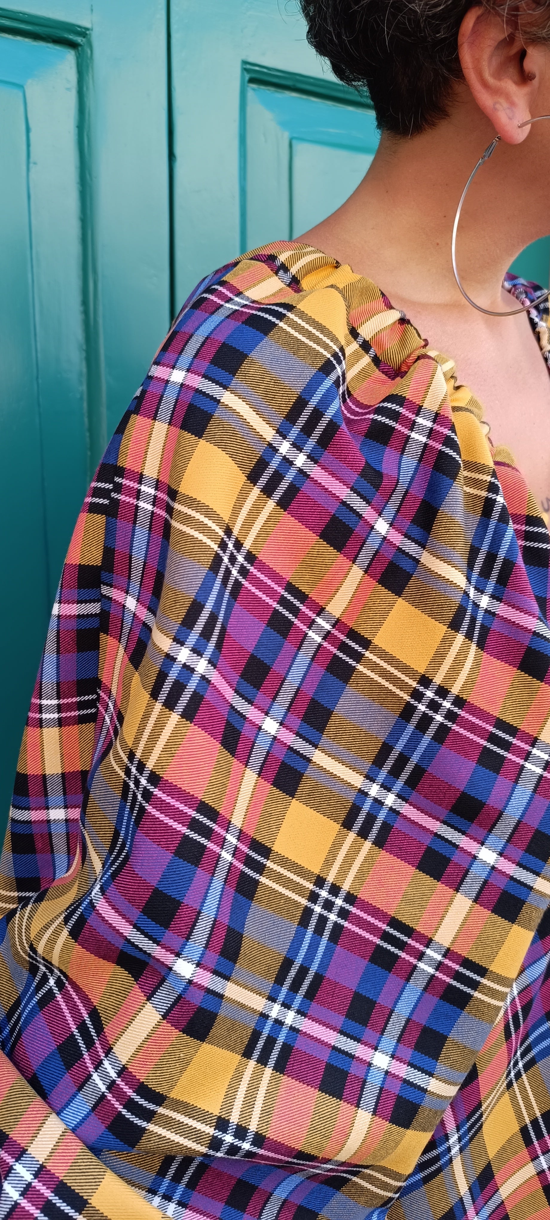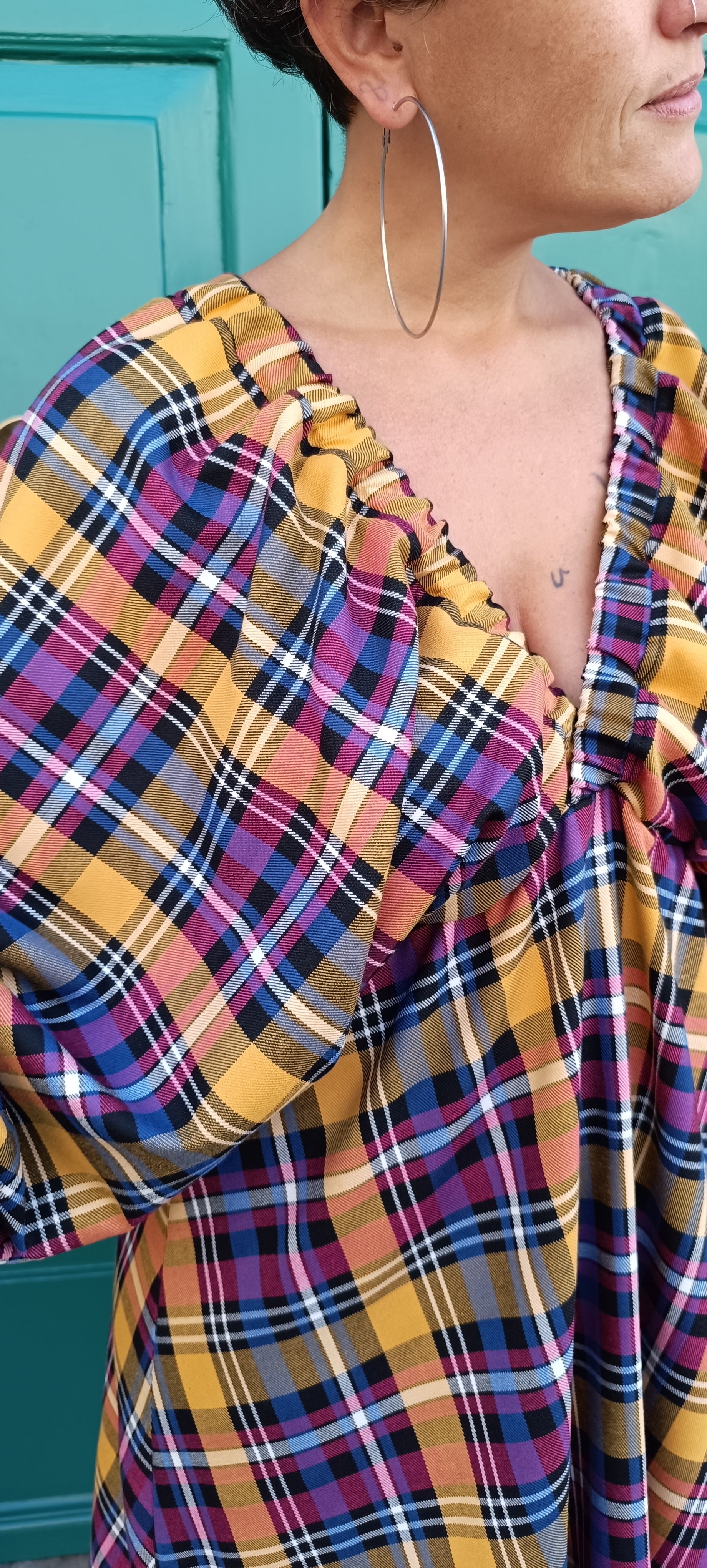 Abito in lanetta, tartan, top con scollo a V profondo su ambo i lati. All’interno dello scollo vi é un elastico per dare alla blusa piú vestibilitá. Un piccolo elastico é presente anche sotto il seno per arricciare il tutto. Manica rifinita con elastico per creare questo effetto sbuffo.