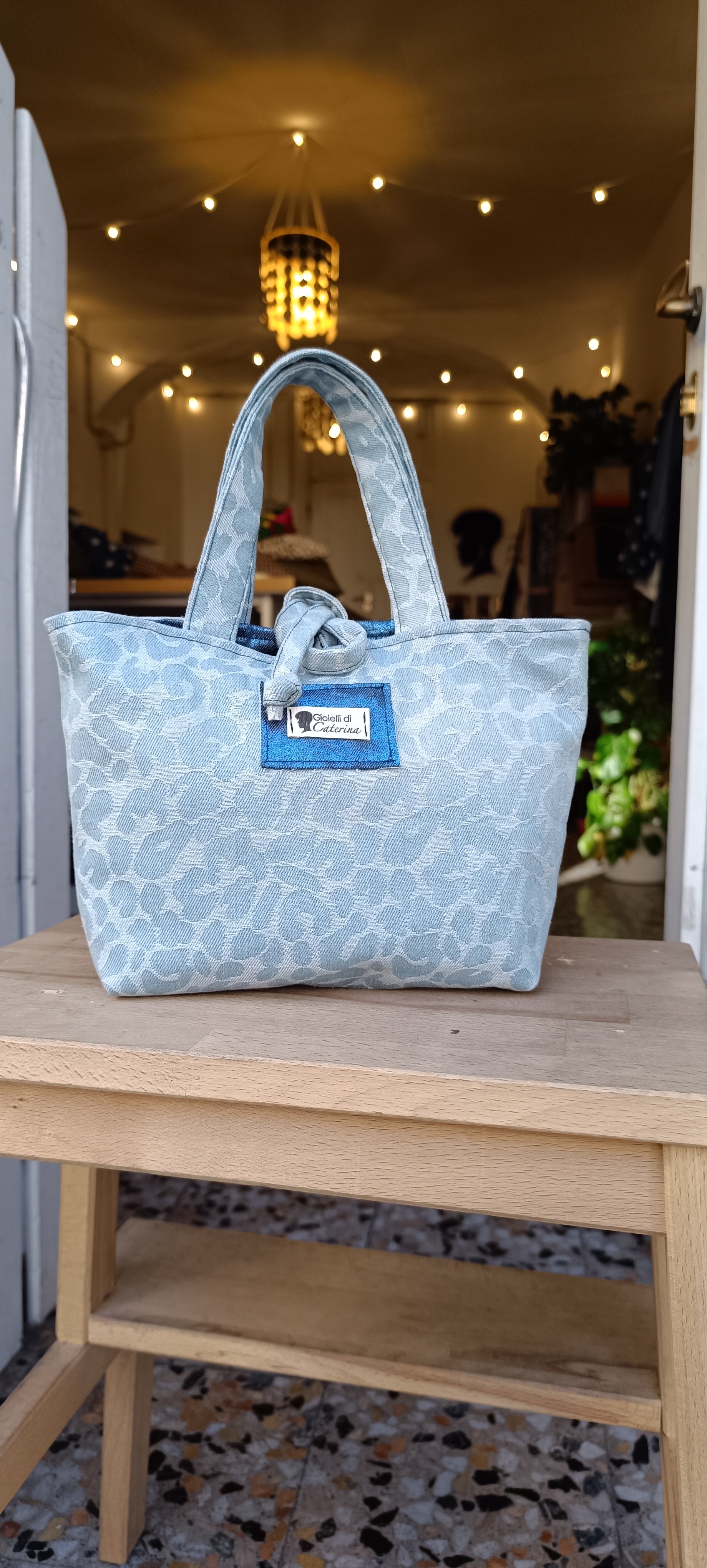 Piccola borsetta a mano deliziosa, come un Bignè. In denim disegno leopardato tono su tono, fodera a contrasto in denim spalmato lucido. Chiusura con laccetto.