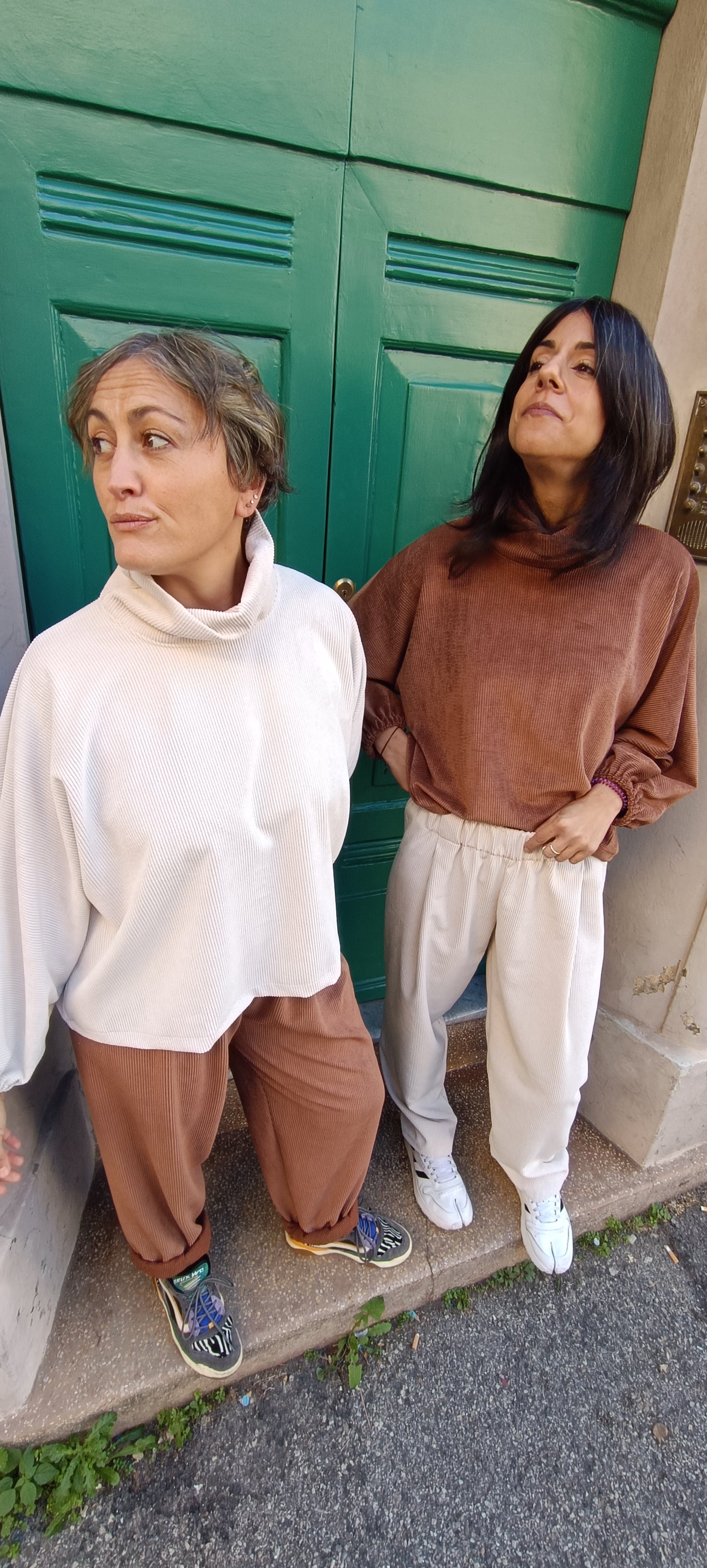 Felpina in velluto a coste con maniche a sbuffo e collo alto.