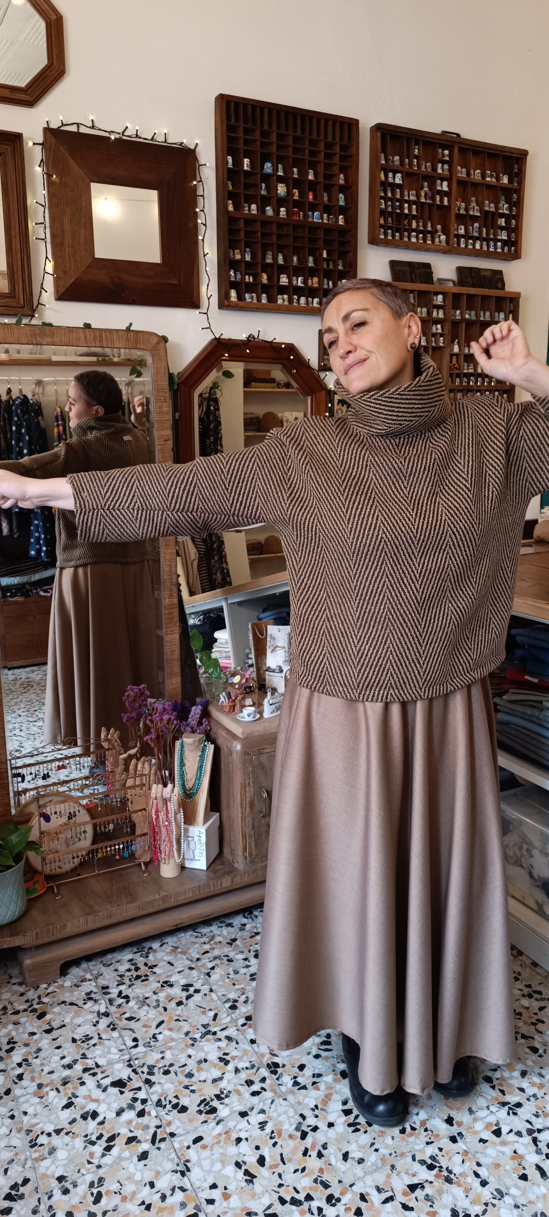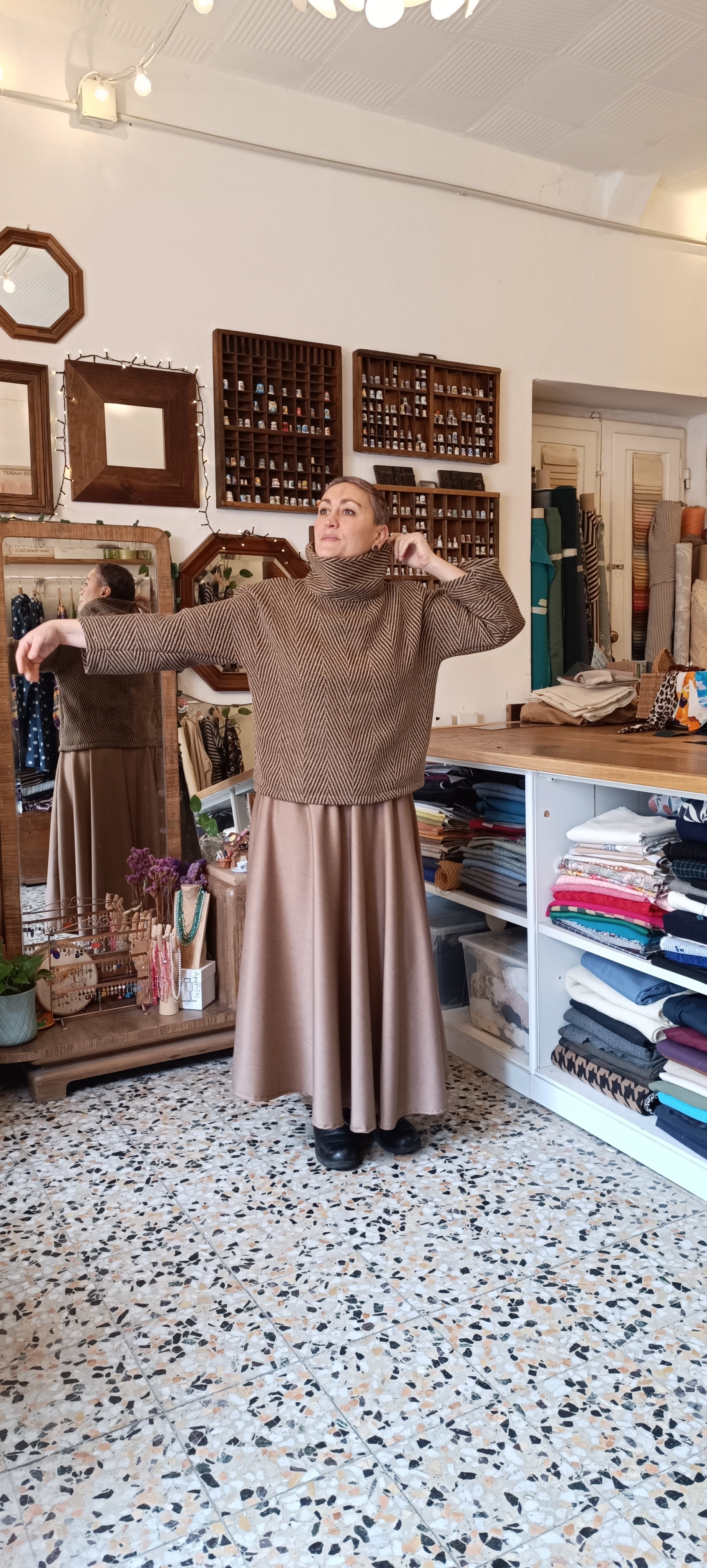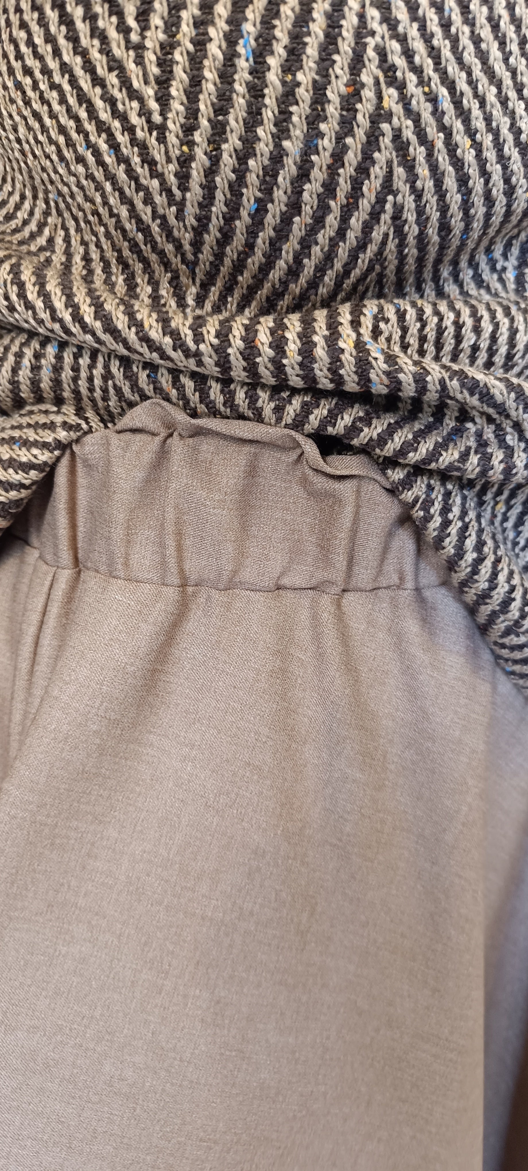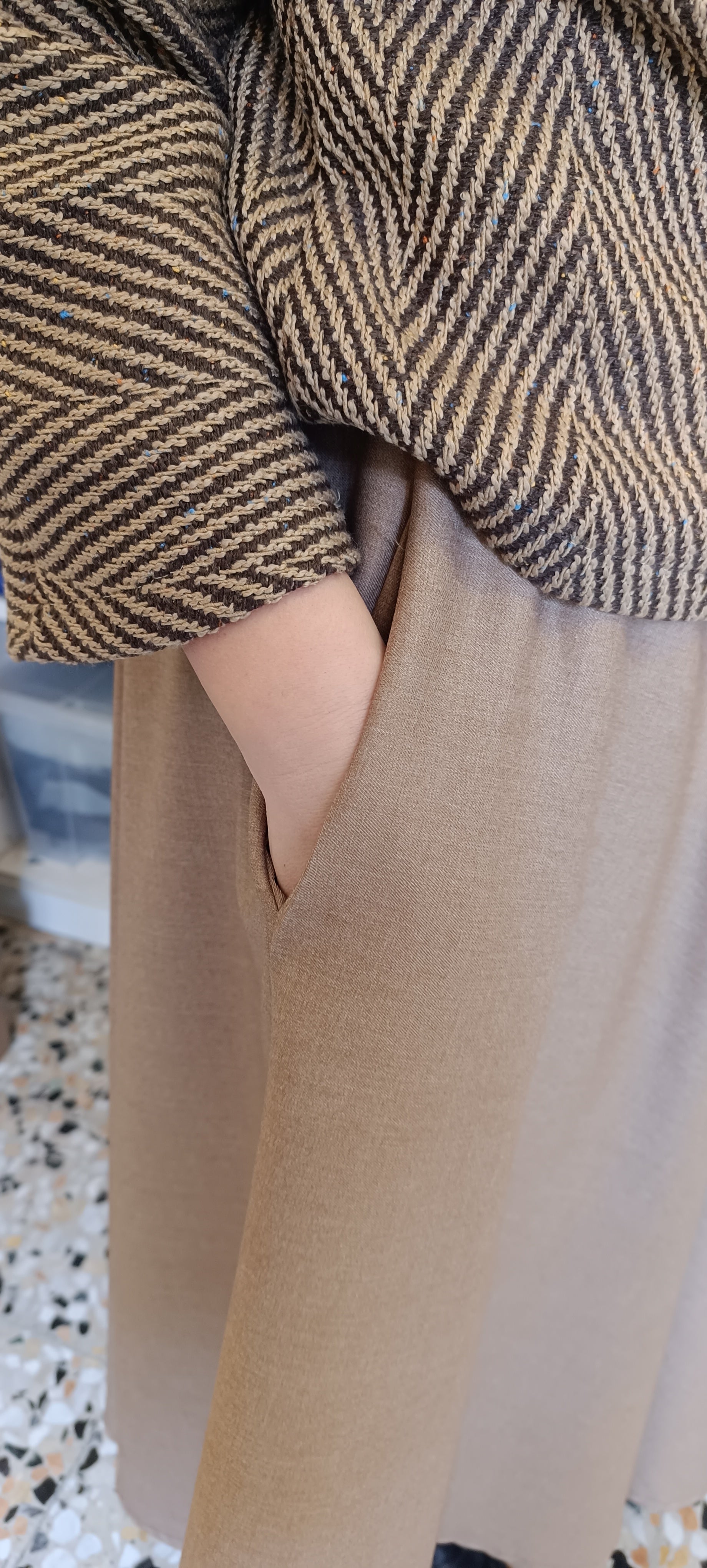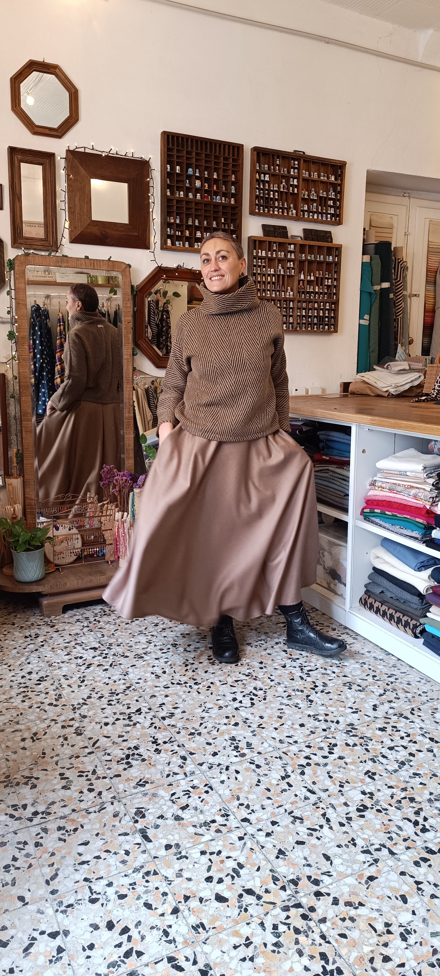 Gonna mezzaruota in viscosa. Elastico in vita ricoperto con tessuto, tasche sui fianchi. Fusciacca in vita per dare un tocco di eleganza coprendo l'elastico.