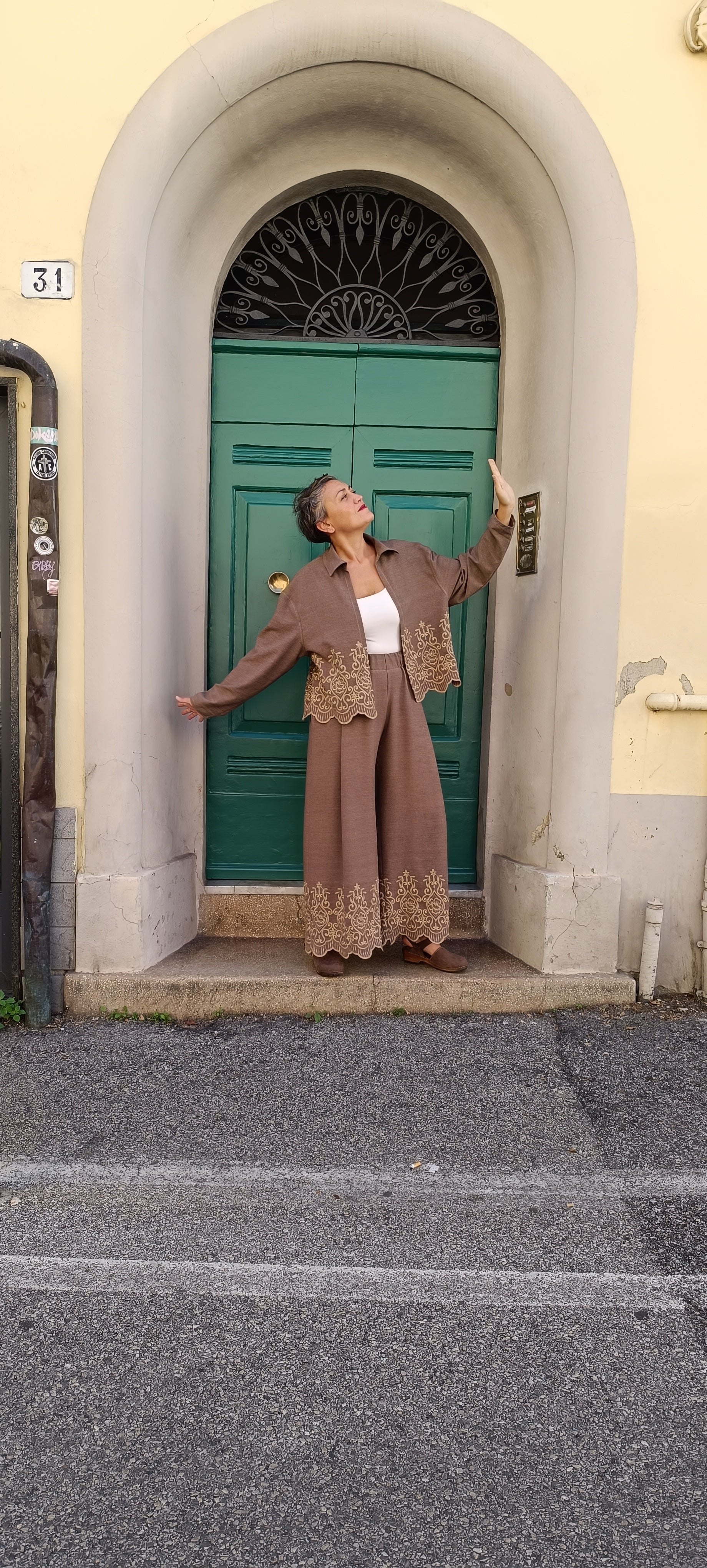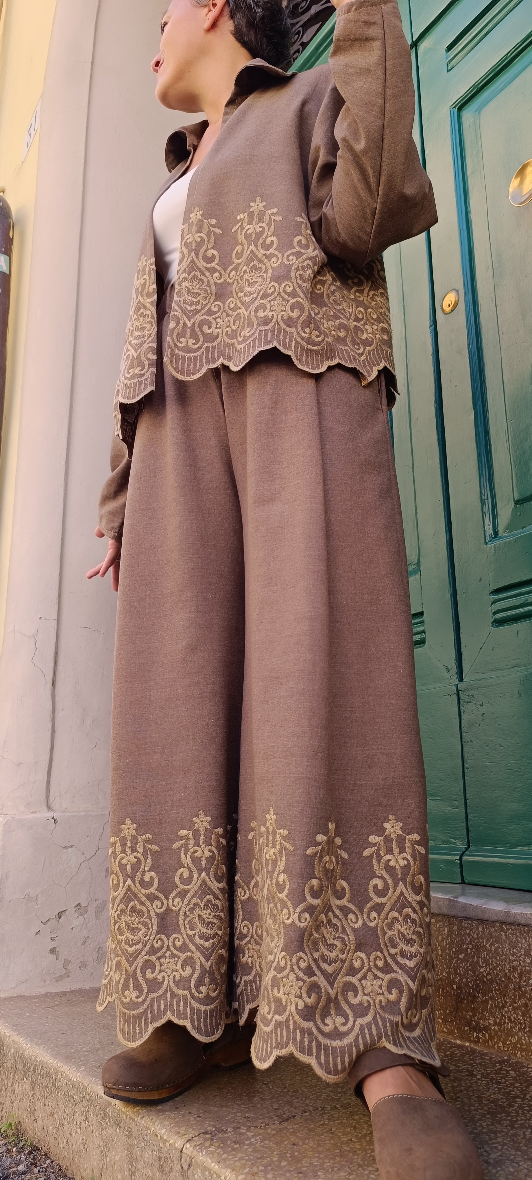 Pantalone vita alta con elastico rivestito e tasche sui fianchi nascoste. Comodi versatili e adatti a tutte le occasioni. Linone color caffellatte con ricamo sulla parte dell’orlo a contrasto color beige.