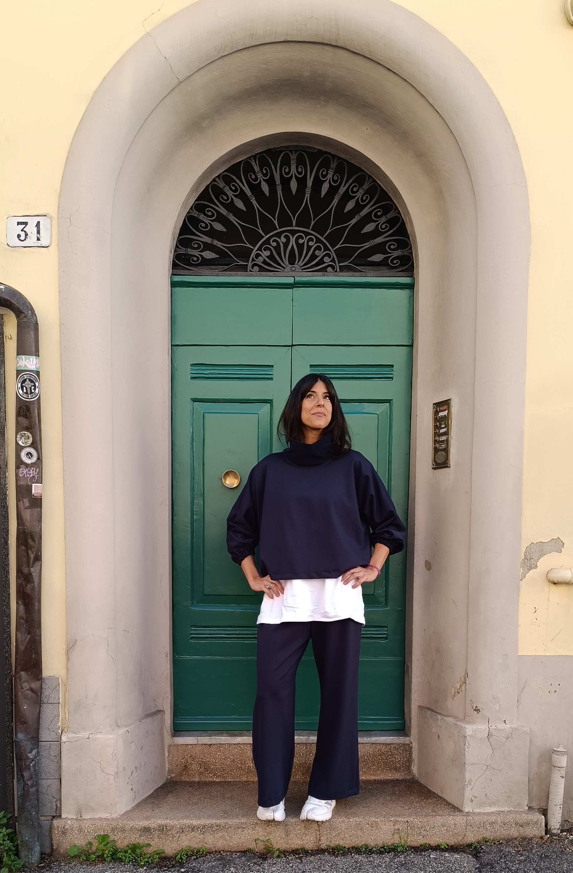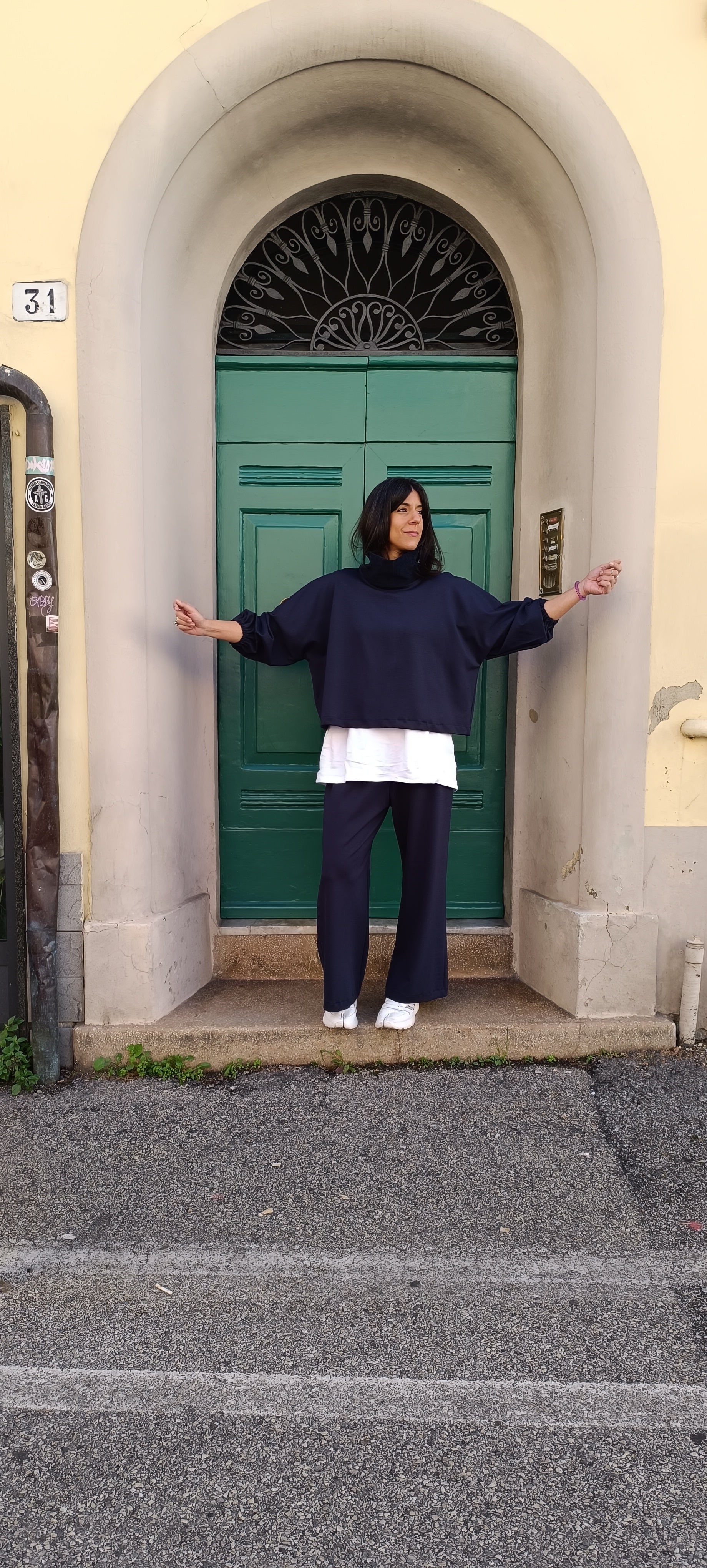 Pantalone palazzo vita alta con elastico rivestito in punto Milano. Comodi versatili e adatti a tutte le occasioni, a palazzo.