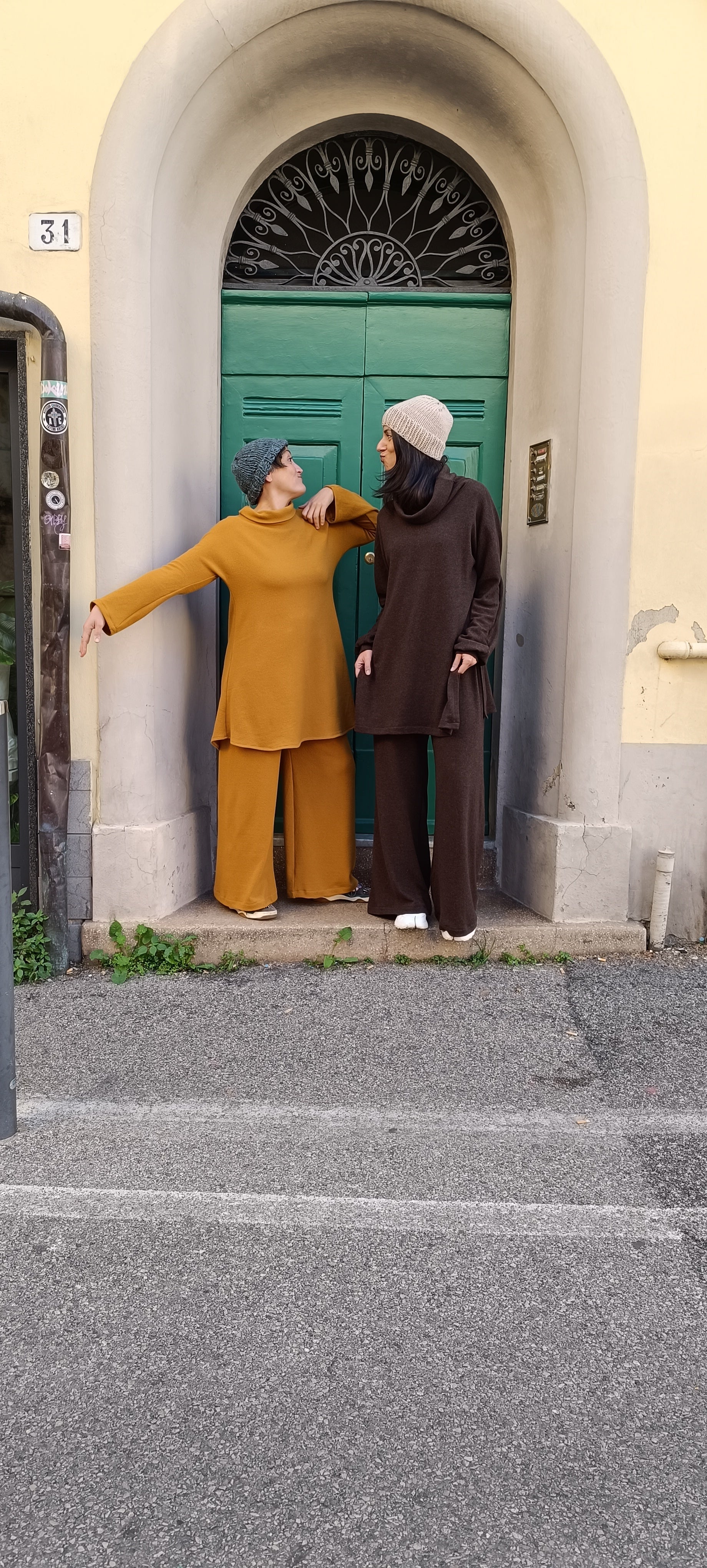 Pantalone palazzo vita alta con elastico rivestito in pura lana. Comodi versatili e adatti a tutte le occasioni, a palazzo.